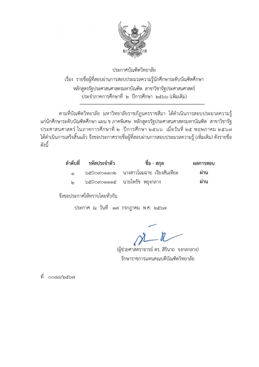 รายชื่อผู้ที่สอบผ่านการสอบประมวลความรู้นักศึกษาระดับบัณฑิตศึกษา หลักสูตรรัฐประศาสนศาสตรมหาบัณฑิต สาขาวิชารัฐประศาสนศาสตร์ ประจำภาคการศึกษาที่ 2 ปีการศึกษา 2566 (เพิ่มเติม)