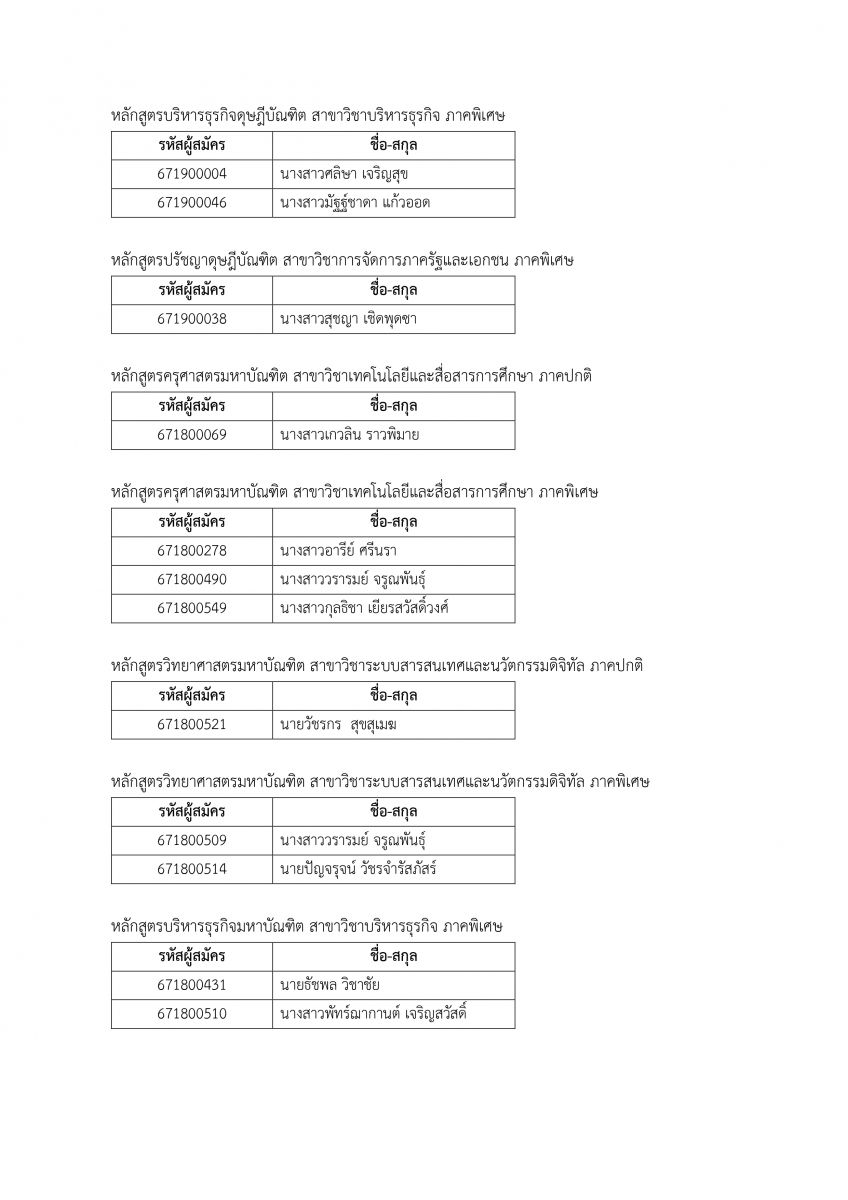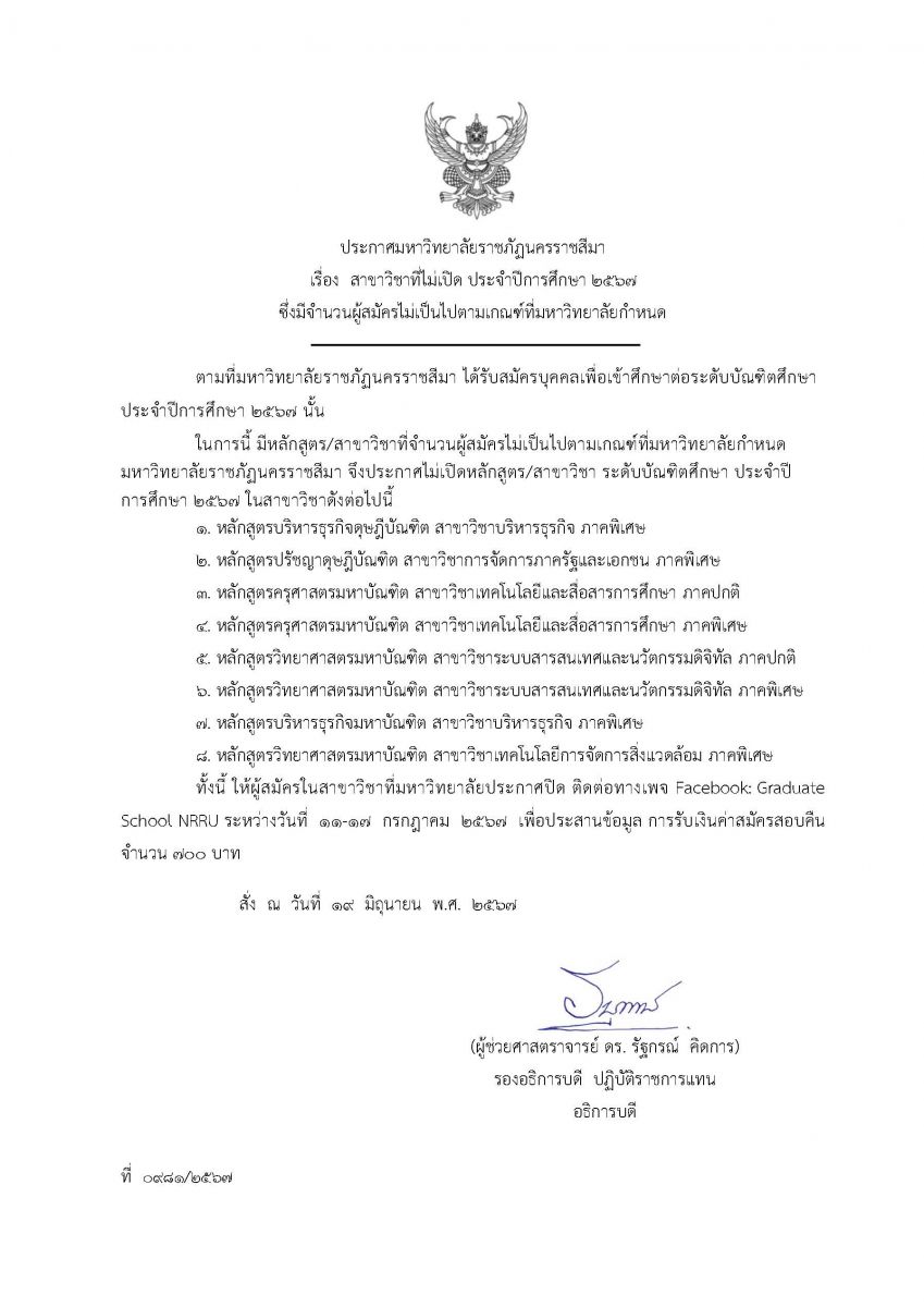 รายชื่อผู้สมัครที่ต้องติดต่อรับคืนค่าสมัคร กรณีสาขาวิชาไม่ได้เปิดในปีการศึกษา 1-2567