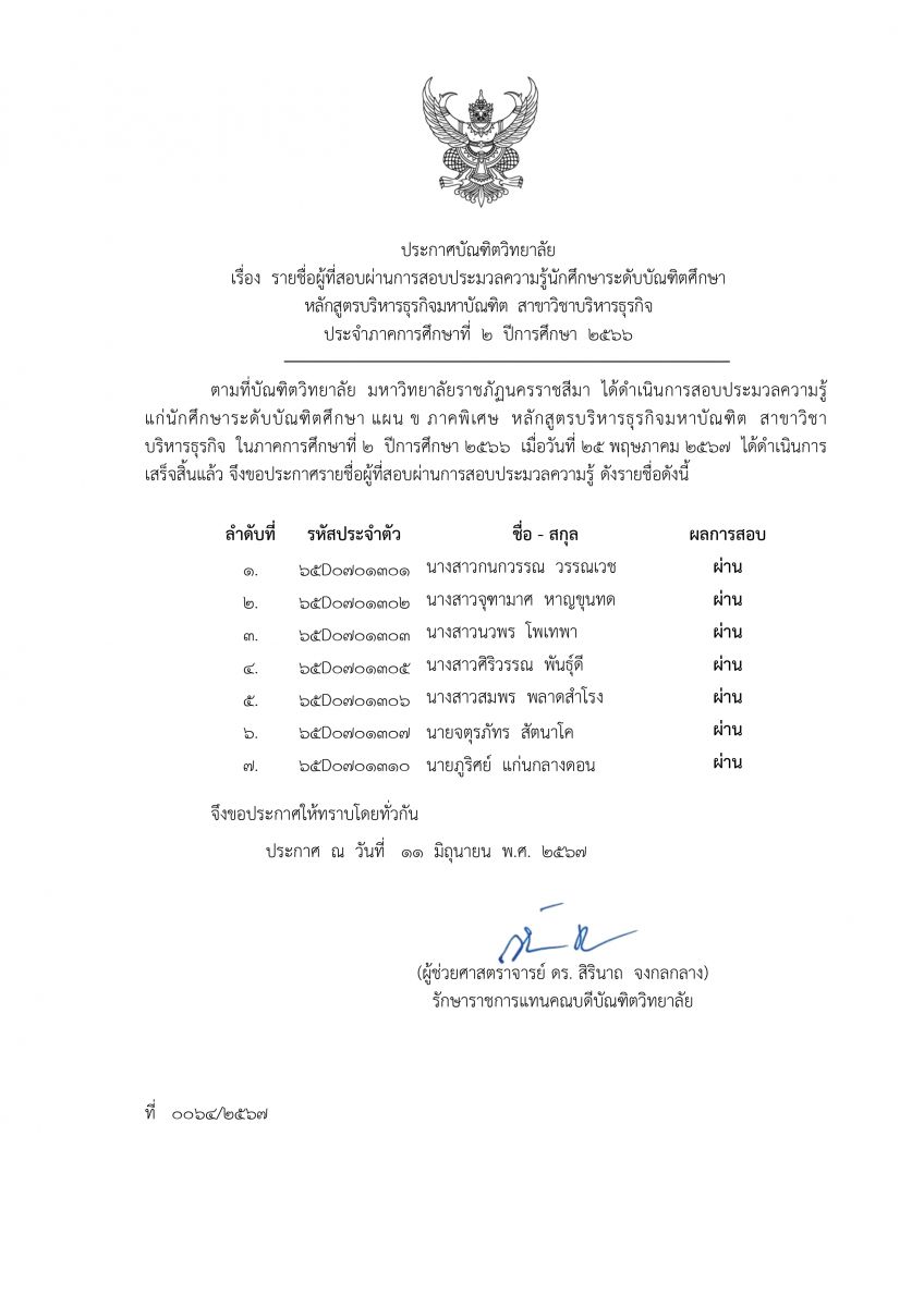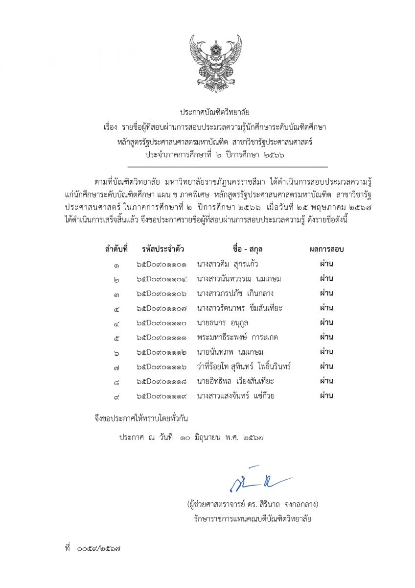 ผลการสอบประมวลความรู้ นักศึกษาระดับปริญญาโท สาขาวิชาบริหารธรุกิจ และ สาขาวิชารัฐประศาสนศาสตร์ ภาคการศึกษาที่ 2 ปีการศึกษา 2566