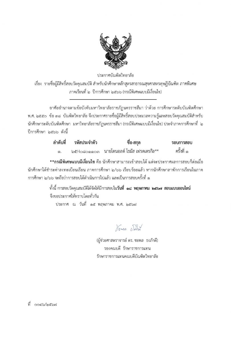 รายชื่อผู้มีสิทธิ์สอบวัดคุณสมบัติ สำหรับนักศึกษาหลักสูตรสาธารณสุขศาสตรดุษฎีบัณฑิต ภาคพิเศษ ภาคเรียนที่ 2 ปีการศึกษา 2566 (กรณีพิเศษแบบมีเงื่อนไข)